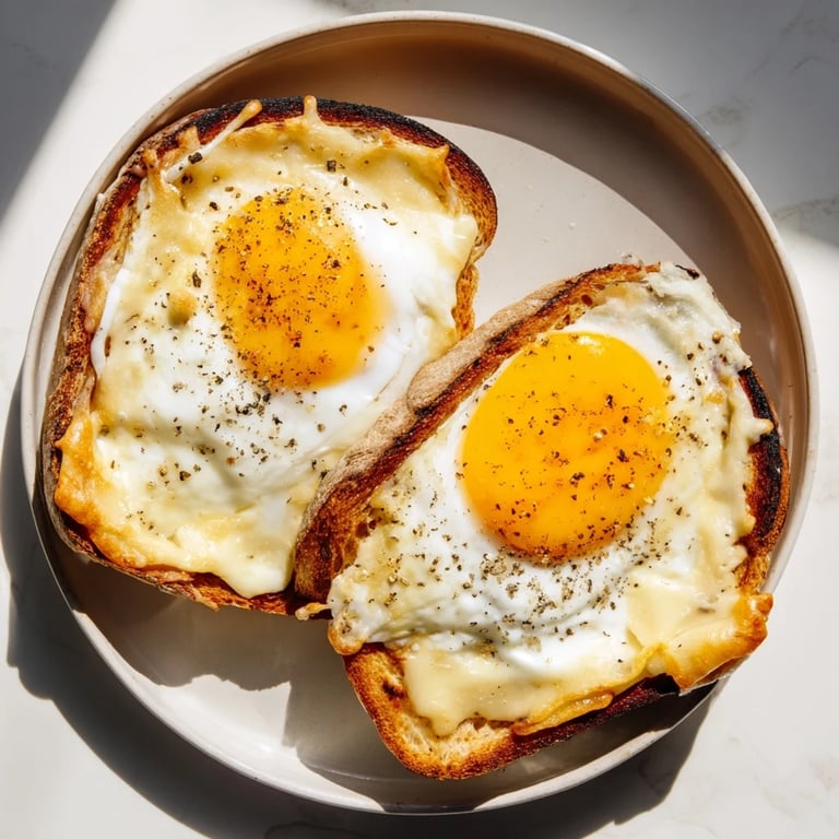 Un toast Croque Madame sans effort avec seulement trois ingrédients : pain, œufs et fromage. Parfait pour les matins pressés et les brunchs, il offre une saveur crémeuse, fromagée et savoureuse avec un minimum d'effort.