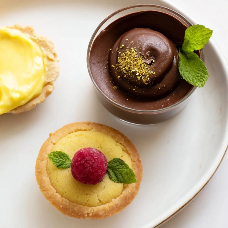 Un plateau de desserts élégant présentant une sélection de mini douceurs—mousse au chocolat, tartelettes au citron et financiers à la framboise—parfait pour impressionner vos invités avec un assortiment étincelant de saveurs et de textures.