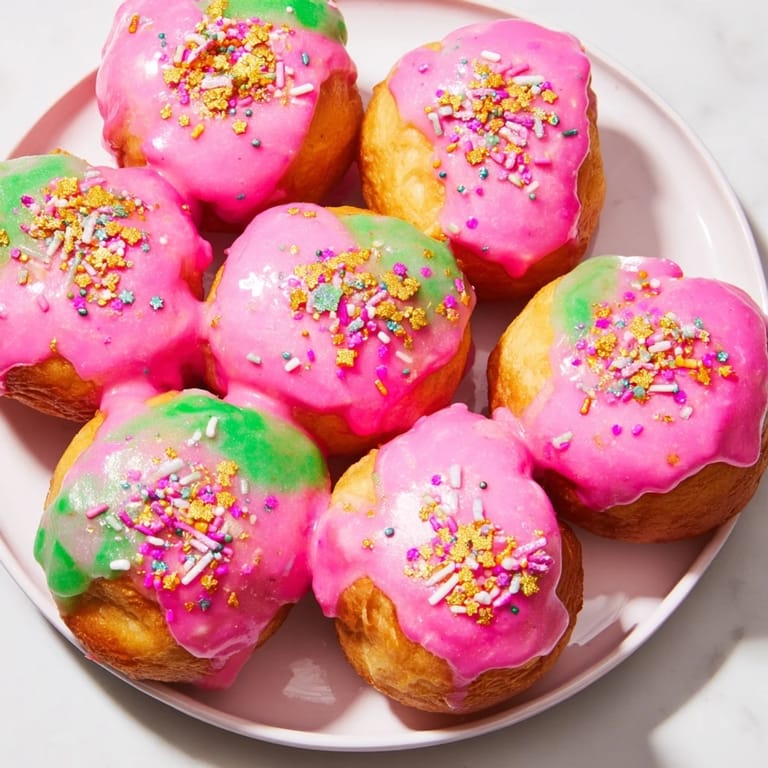 Épingler Une brioche festive et moelleuse façonnée comme de grands beignets colorés, décorée de glaçage et de vermicelles arc-en-ciel—parfaite pour les fêtes ou les célébrations de fin d'année.