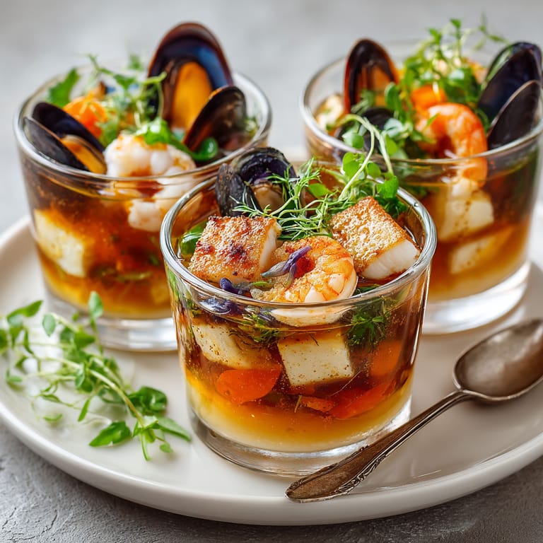 Épingler Voici une version revisitée et élégante de la bouillabaisse, servie en verrines façon amuse-bouches raffinés. Cette approche déstructurée allie tous les parfums caractéristiques du célèbre ragoût provençal tout en mettant l’accent sur la beauté visuelle et l’intensité des saveurs. Parfaite pour épater vos invités lors d’un apéritif sophistiqué ou d’un événement festif, cette recette propose chaque élément disposé en couches harmonieuses dans un petit verre.