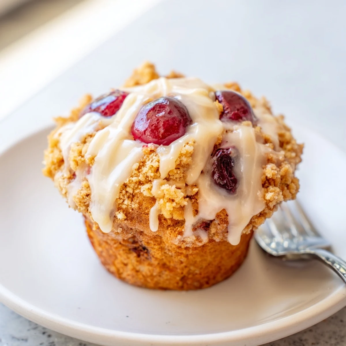 Muffins Cherry Éclair Latte arrosés de glaçage vanille et éclats de cerises juteuses. | recettox.com