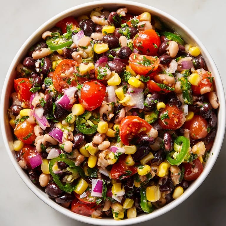 - Dans un grand saladier réunir haricots noirs pois à œil noir tomates maïs poivrons oignon jalapeño et coriandre Mélanger avec une spatule large délicatement pour garder les grains intacts