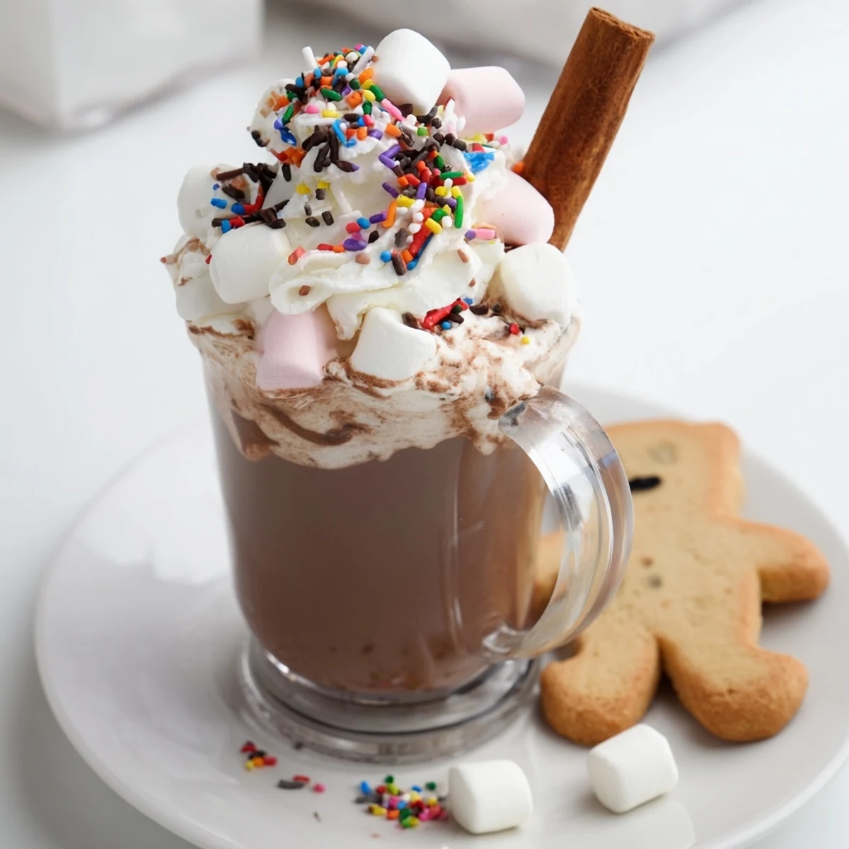 - Garnitures : 2 tasses de mini guimauves, ½ tasse de crème fouettée, ⅓ tasse de copeaux de chocolat, ¼ tasse de sauce caramel, ¼ tasse de bonbons à la menthe écrasés, ¼ tasse de mini pépites de chocolat, ¼ tasse de morceaux de toffee, ¼ tasse de vermicelles arc-en-ciel