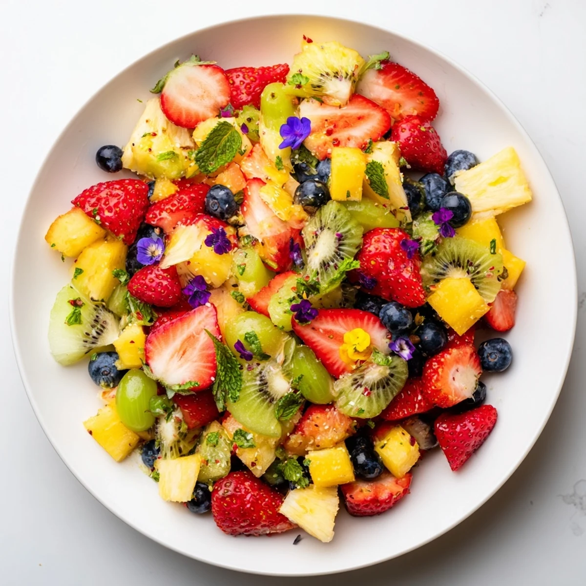 - Juste avant de servir, saupoudrez de menthe fraîche et décorez avec des fleurs comestibles pour une touche festive.