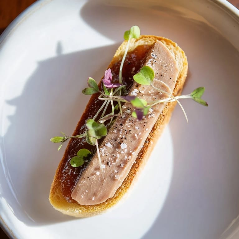 - Garnitures: 100 g (3.5 oz) de foie gras (idéalement de terrine ou torchon, frais), 2 c. à café de confiture de figues ou marmelade d'oignons, 1 c. à soupe de beurre non salé (pour griller), sel marin en flocons, poivre noir fraîchement moulu, ciboulette ou pousses pour la garniture (facultatif)