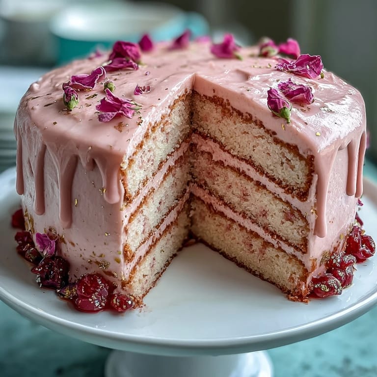 Épingler La première fois que j’ai tenté ce gâteau rosé velours avec son élégant coulis doré, l’air de la cuisine était empli d’une musique légère et de parfums de vanille mêlés à une pointe de vin. J’ai choisi ce défi pour un après-midi pluvieux, poussée par l’envie de transformer une journée ordinaire en quelque chose de féerique. En mélangeant la pâte, j’ai su, à la couleur rose nacrée, que ce gâteau serait le clou de la fête. Entendre le fouet battre et voir la crème mousser m’a donné l’impression d’orchestrer un petit ballet sucré. Rien que le contraste du chocolat blanc, du luster doré et du parfum de rosé rend ce dessert inoubliable, même avant la première bouchée.