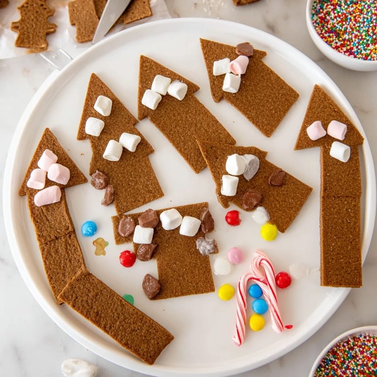 Épingler Un plateau de fête interactif et festif comprenant des pièces de maison en pain d'épices, des bonbons assortis et des sucreries décoratives pour construire et savourer vos propres créations comestibles en pain d'épices.