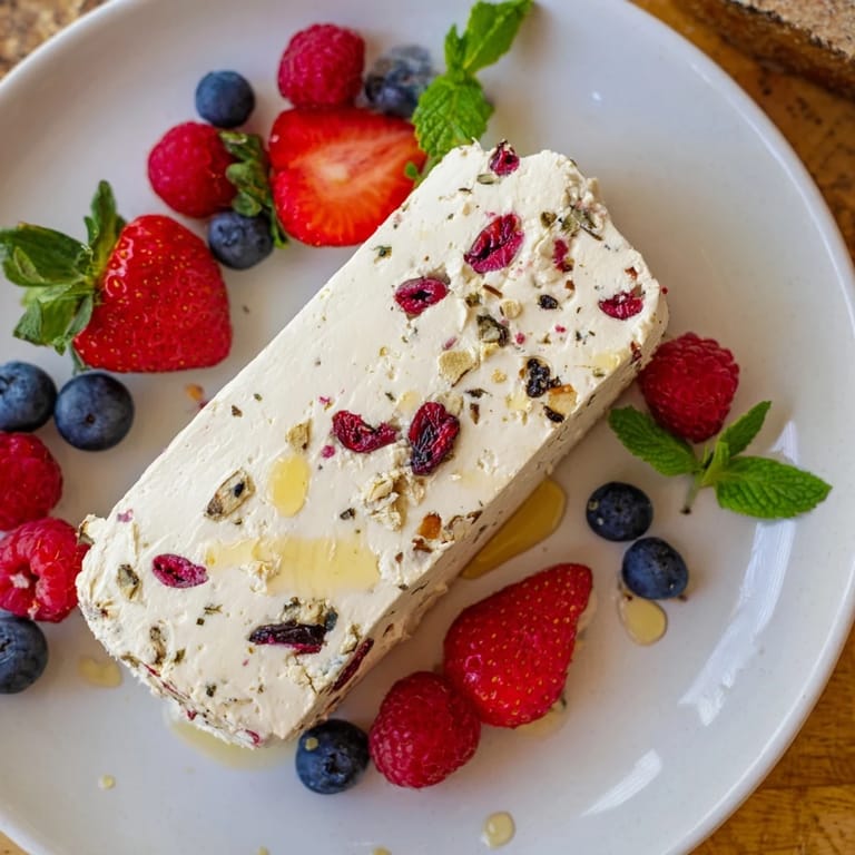 Épingler Un bûche de fromage de chèvre crémeuse et festive parsemée de canneberges séchées acidulées, servie avec un assortiment de baies fraîches pour un apéritif ou une collation colorée et élégante.
