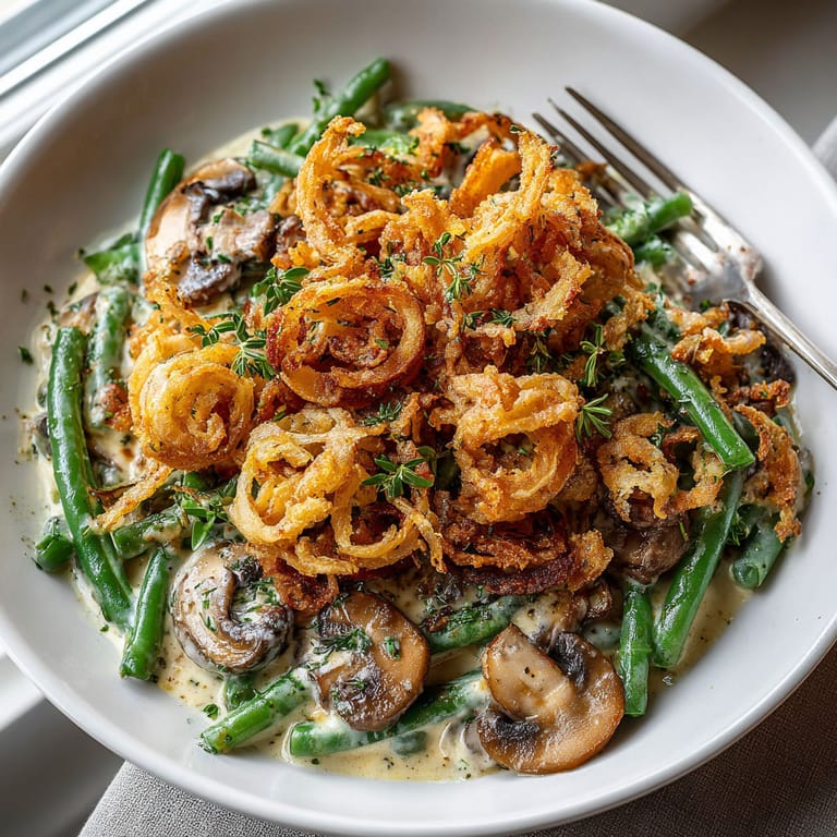 Épingler Ce gratin de haricots verts façon maximaliste revisite le classique américain avec une onctueuse sauce crémeuse aux champignons et des montagnes d’oignons frits croustillants maison, pour un plat festif, généreux et ultra-savoureux. C’est la touche spectaculaire à servir pour régaler famille et amis lors de vos occasions spéciales ou repas réconfortants.