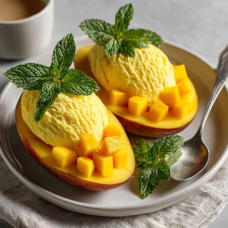 Servez chaque demi-mangue givrée sur une assiette décorée de fleurs comestibles ou de zestes de citron vert pour accentuer la fraîcheur en visuel. Pour une touche gourmande, ajoutez un coulis de fruits de la passion ou de la noix de coco râpée sur le dessus juste avant de présenter.