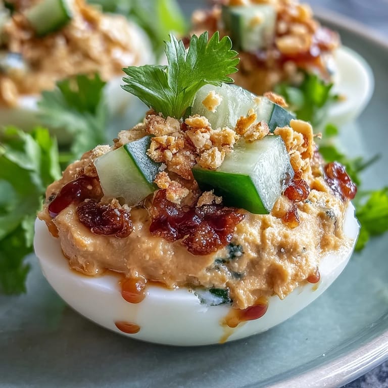 Épingler La première fois que j’ai pensé à glisser du beurre de cacahuète dans des œufs mimosa, c’était en préparant un brunch improvisé entre amis, là où chacun ramenait un petit quelque chose à grignoter. Tandis que la musique jazzy vibrait doucement dans la cuisine, le parfum du gingembre frais et du citron vert a envahi la pièce. J’ai ressenti ce mélange de curiosité et d’excitation en associant ces saveurs classique et thaïlandaise. Un grand saladier de concombres frais attendait sur le comptoir, m’invitant à tenter ce croquant en garniture. Cette version, épicée et vive, a été un vrai clin d’œil à la spontanéité de ce matin-là.