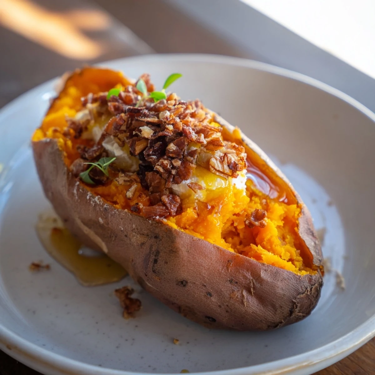 Épingler Une recette réconfortante et élégante où le fromage de chèvre crémeux et le miel doux se marient au coeur de patates douces tendres, idéale en plat principal végétarien ou en accompagnement sophistiqué.