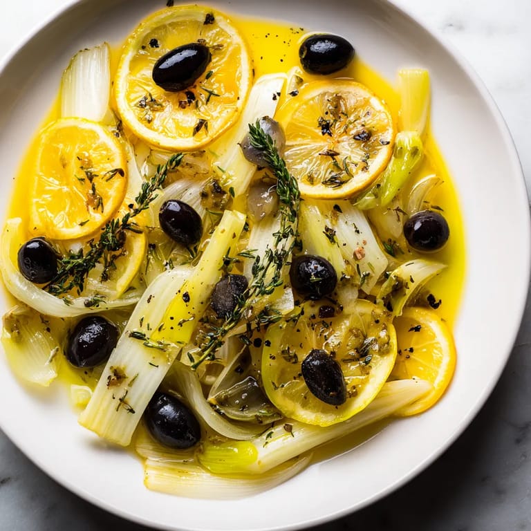 Épingler Le blanc de poireau braisé au citron confit et olives noires est la recette parfaite pour ceux qui cherchent à sublimer les légumes du quotidien avec une touche méditerranéenne. Doux et fondants, les poireaux s’imprègnent du parfum envoûtant du citron confit, relevés juste ce qu’il faut par la saveur profonde des olives noires. Ce plat élégant s’invite aussi bien en accompagnement raffiné qu’en plat principal léger accompagné d’un peu de pain frais.