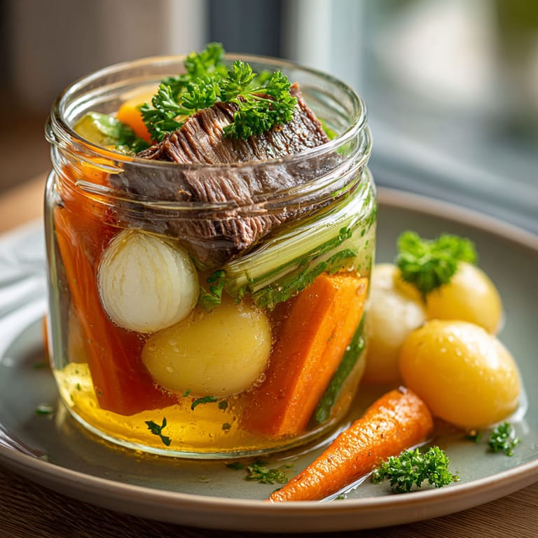 Épingler Un pot-au-feu moderne en bocaux revisite la grande tradition française avec une présentation élégante et individuelle, tout en conservant l’explosion de saveurs et la richesse du bouillon, des morceaux fondants de bœuf et des légumes de saison. Cette version contemporaine apporte simplicité et réconfort, parfaite à partager ou à emporter.