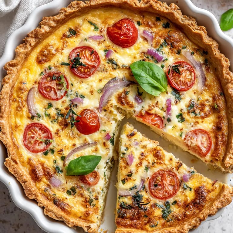 Épingler Cette quiche lorraine végétarienne célèbre la générosité de la cuisine familiale française tout en y apportant une touche fraîche grâce aux tomates cerises juteuses et au basilic parfumé. Sa garniture crémeuse et son fond de tarte croustillant en font un plat aussi convivial qu’élégant pour recevoir ou tout simplement régaler les gourmands autour de la table.