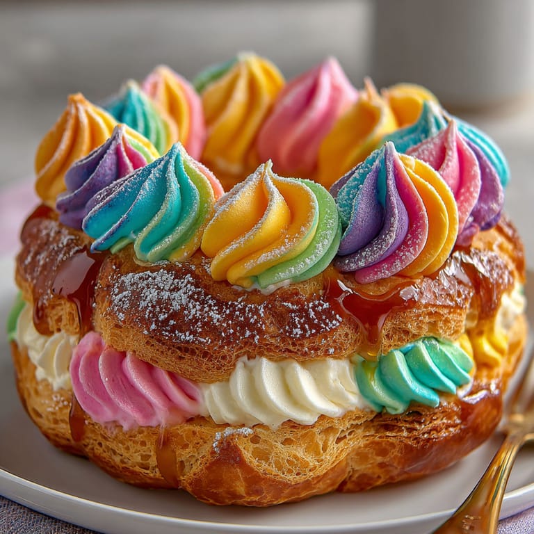 Épingler Ce dessert Saint-Honoré Chaotique aux Couleurs Psychédéliques transforme la pâtisserie classique française en un spectacle vibrant. Grâce à ses choux multicolores, ses crèmes diplomates éclatantes et ses décors fantaisistes, cette version moderne étonne par son originalité tout en respectant le raffinement d’un grand gâteau traditionnel.