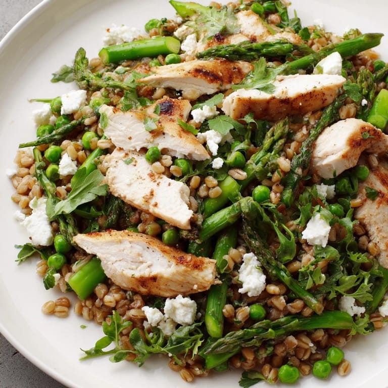 - Dans un grand bol, combinez le farro cuit, les tranches de poulet, les asperges blanchies, les pois et la roquette ou les épinards. Arrosez de vinaigrette et mélangez délicatement pour enrober tous les ingrédients.