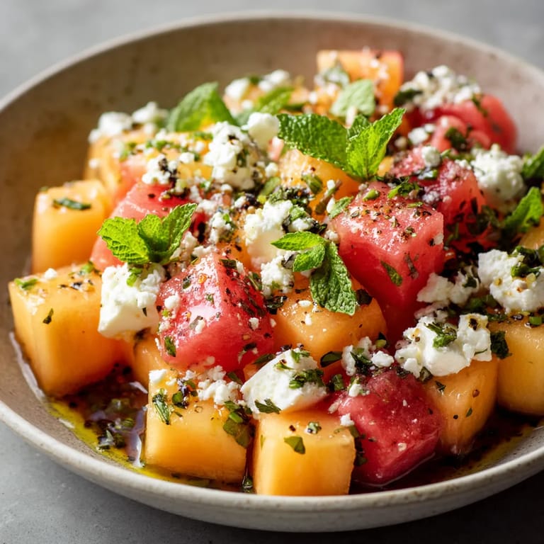 En France, la salade de melon à la menthe fait partie des classiques du début de l’été, souvent associée aux repas en plein air. Cette version enrichie de feta s’inspire de la cuisine méditerranéenne, où melons, herbes fraîches et fromages s’associent volontiers. Elle symbolise la générosité des marchés de saison et le plaisir de partager en famille.