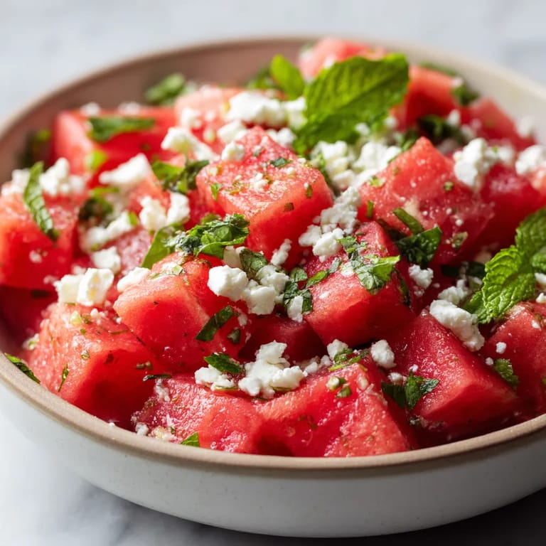 - Découpez la pastèque en cubes réguliers et jetez les graines Émiettez la feta à la main et effeuillez puis hachez finement la menthe fraîche chaque élément doit être bien préparé pour un dressage harmonieux
