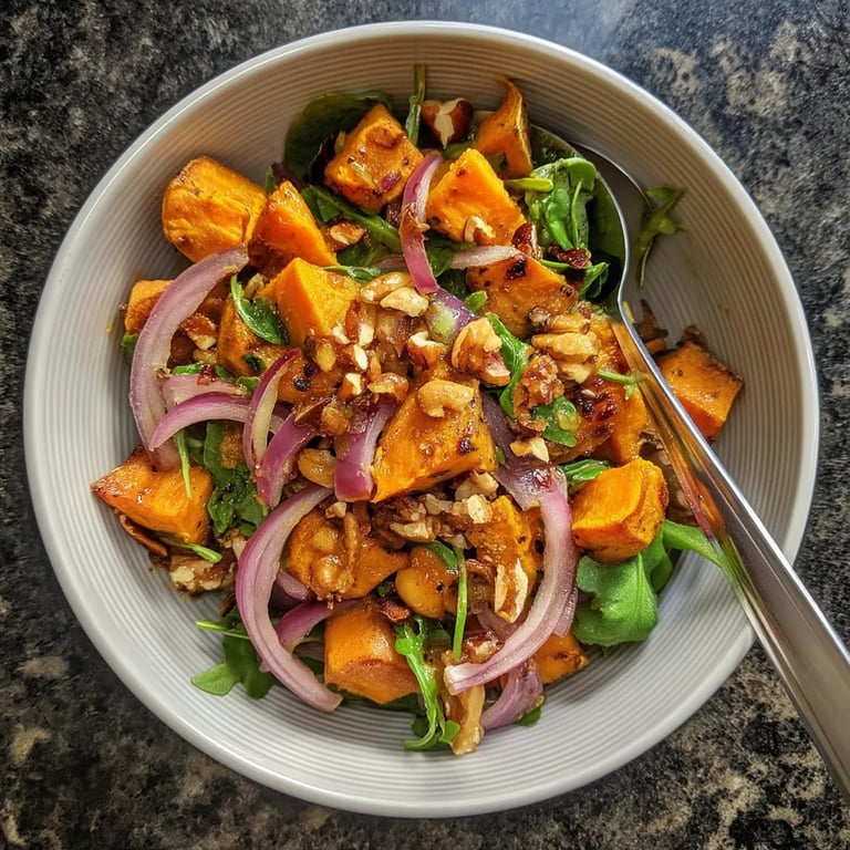 Épingler Cette salade tiède de patate douce combine la douceur des légumes rôtis avec le croquant des noix et la fraîcheur de la roquette pour créer un plat équilibré et savoureux, parfait comme repas complet ou accompagnement sophistiqué.