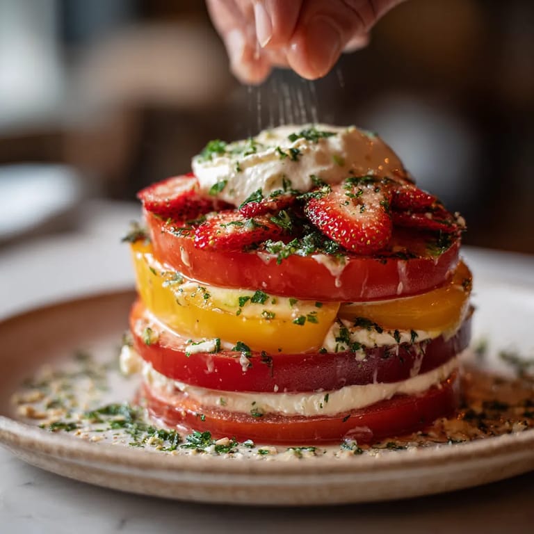 Épingler Cette salade de tomates anciennes, fraises et ricotta est idéale pour les jours ensoleillés où l’on cherche un plat frais et plein de couleur. L’association inattendue entre la douceur fruitée des fraises et l’acidité vibrante des tomates crée une harmonie étonnante. Je trouve que le nuage crémeux de ricotta qui fond doucement sur le dessus fait toute la différence pour transformer chaque bouchée en un véritable moment de gourmandise.