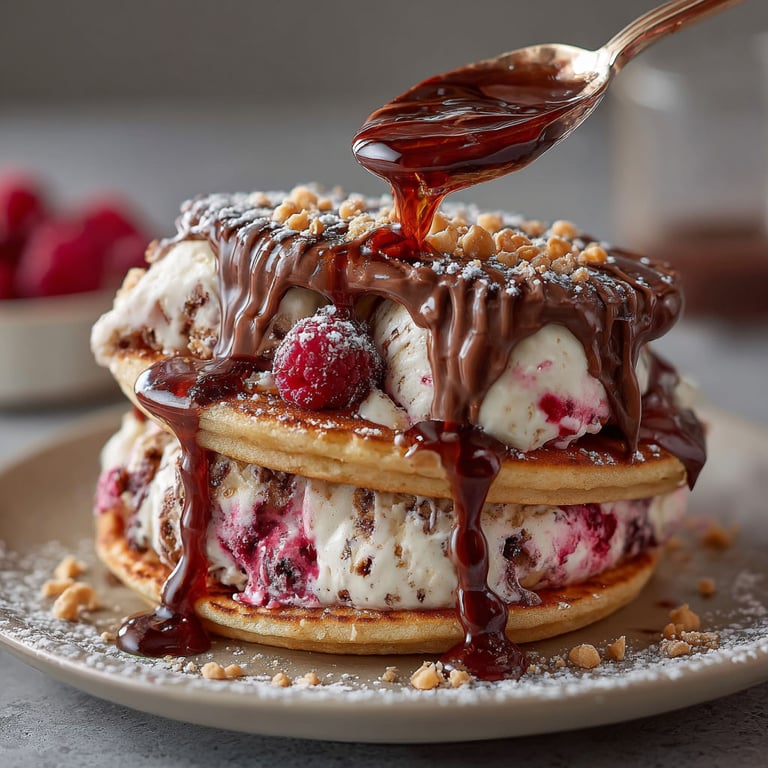 Épingler Ce dessert glacé réunit tout le plaisir des pancakes dorés maison et la fraîcheur fondante d’une glace marbrée à la framboise, le tout rehaussé par la gourmandise du chocolat blanc et d’une coque croquante au chocolat au lait. C’est la gourmandise estivale idéale, surprenante et ludique, qui attire tous les regards et fait l’unanimité à la première bouchée.