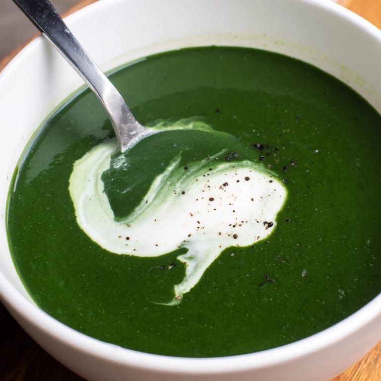 Épingler A velvety, creamy spinach soup featuring tender greens, aromatic vegetables, and a touch of cream—perfect as a light starter or warming lunch. This simple yet elegant dish combines the earthy flavor of fresh spinach with the subtle sweetness of sautéed onions and garlic, balanced by a hint of nutmeg.
