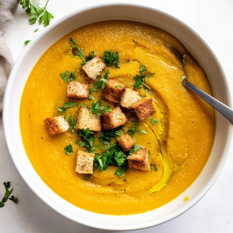 Le persil frais, un filet d'huile d'olive extra vierge et des croutons ou graines torréfiées ajoutent du croquant. Une noix de crème ou quelques dés de légumes rôtis réservés apportent également une belle présentation.