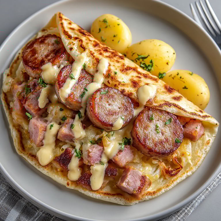 Placez une tortilla à plat. Disposez éventuellement des lamelles de pomme de terre au centre. Ajoutez une généreuse portion de garniture à la choucroute et aux viandes, nappez de sauce fromagère. Repliez les côtés, puis la base, et roulez fermement comme un burrito.