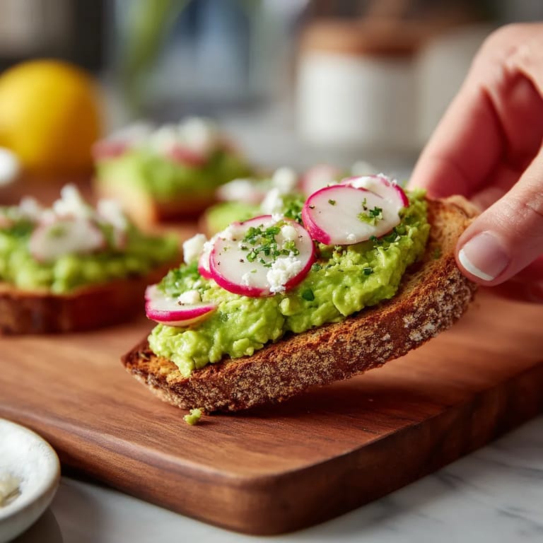- Si vous préférez votre pain grillé, passez-le au grille-pain jusqu'à obtenir une coloration dorée. Étalez généreusement la purée d'avocat sur chaque tranche. Disposez artistiquement les rondelles de radis en les faisant légèrement se chevaucher pour un effet visuel agréable.