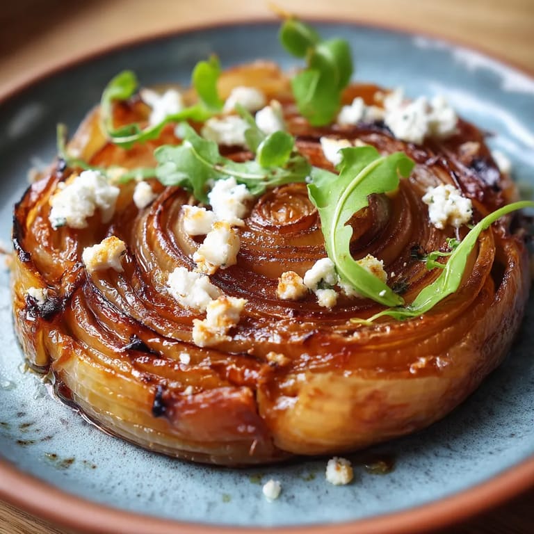 - Enfournez à 190°C pendant 25 à 30 minutes en surveillant régulièrement. La pâte doit être uniformément dorée et croustillante. À la sortie du four, laissez reposer 5 minutes exactement pour que les jus se stabilisent. Posez un plat de service sur la poêle et retournez d'un geste vif mais délicat. Soulevez doucement la poêle en laissant la chaleur faciliter le démoulage. Si des oignons restent collés, replacezles délicatement sur la tarte. Parsemez de fromage émietté et de quelques feuilles de roquette juste avant de servir.