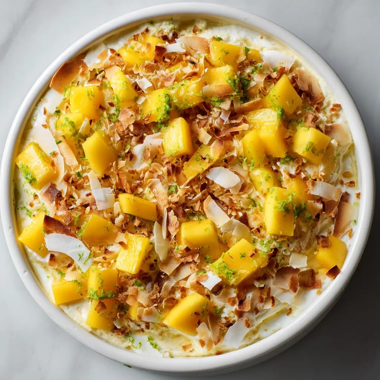 - Au moment de servir, parsemer de dés de mangue restants, de zeste de citron vert finement râpé et d’éclats de noix de coco toastée.