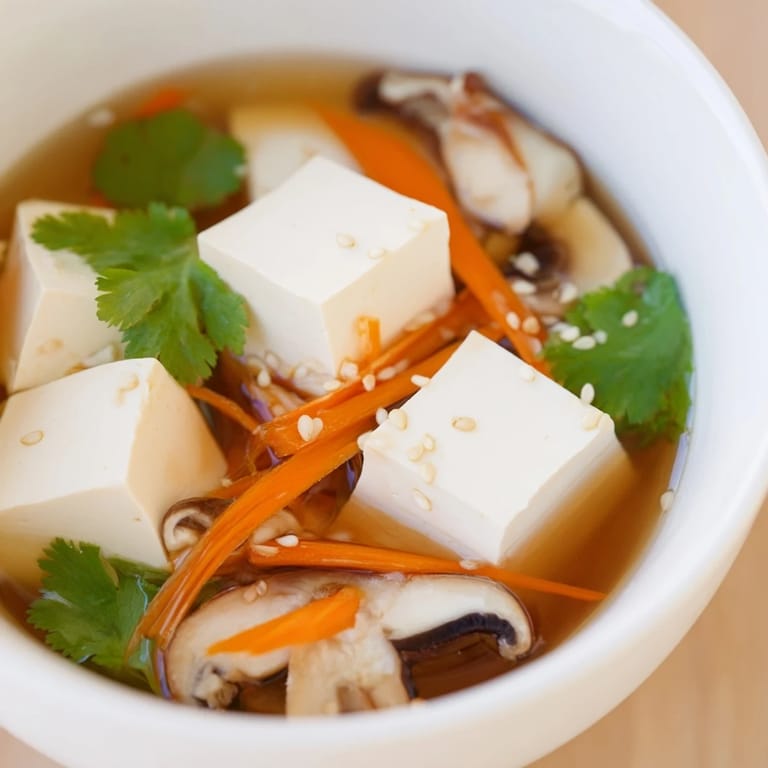 Épingler Je préparais ce bouillon un soir de semaine où j'avais besoin de quelque chose de réconfortant sans effort. Le parfum du gingembre et de l'ail qui grésillaient dans l'huile de sésame a immédiatement changé l'atmosphère de ma cuisine. J'ai ajouté les légumes un par un, observant les couleurs vives se mêler au bouillon doré. Le tofu soyeux glissait délicatement dans la soupe, fragile et doux. En quelques minutes, j'avais devant moi un bol fumant qui ressemblait à un câlin liquide.