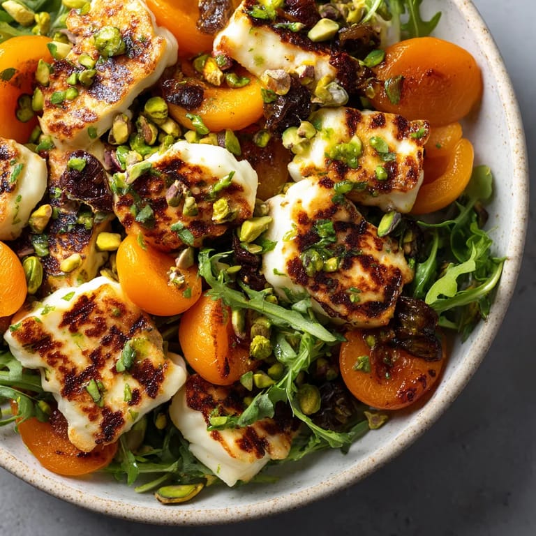 Si vous n’avez pas de halloumi essayez un fromage à griller type feta ferme ou même une mozzarella de bufflonne très fraîche. Les abricots peuvent être remplacés par des pêches ou des nectarines mûres selon la saison. Pour une version sans pistaches pensez aux noisettes grillées ou aux amandes effilées.