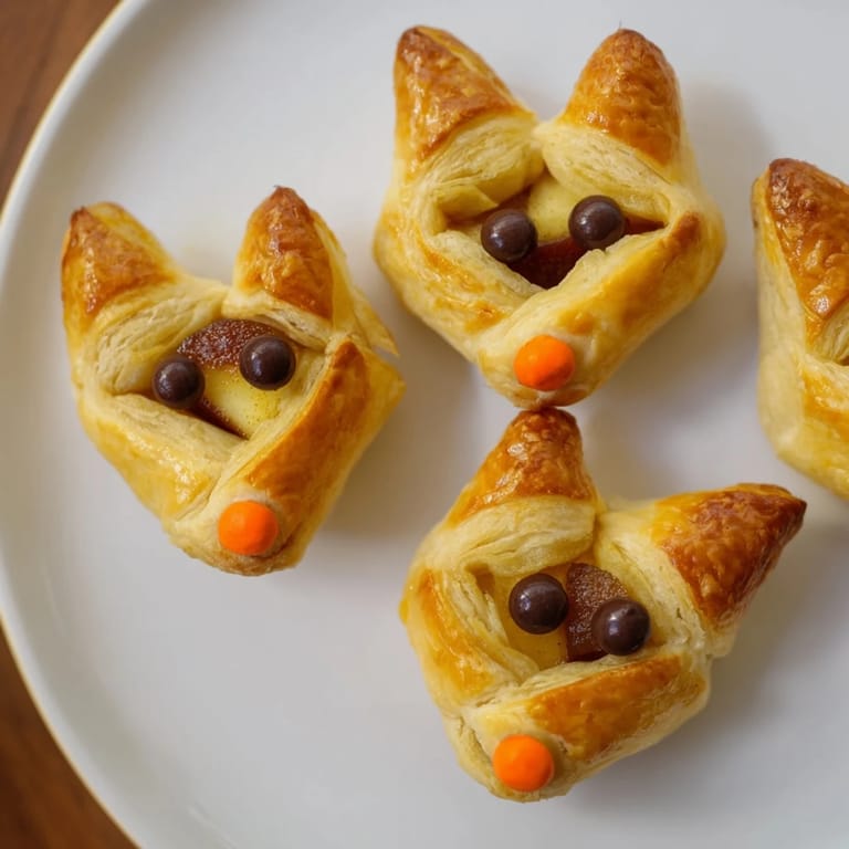 Ces bouchées feuilletées en forme de renard marient la douceur des pommes et des poires épicées avec une pâte croustillante et délicate. Faciles à préparer et parfaites pour partager lors des rassemblements d'automne, elles apportent une touche ludique et gourmande à vos pauses sucrées. Le mélange cannelle, muscade et sucre brun réchauffe les saveurs, tandis que la décoration chocolatée ajoute charme et plaisir. Un vrai régal pour petits et grands, à déguster tiède après une cuisson rapide au four.