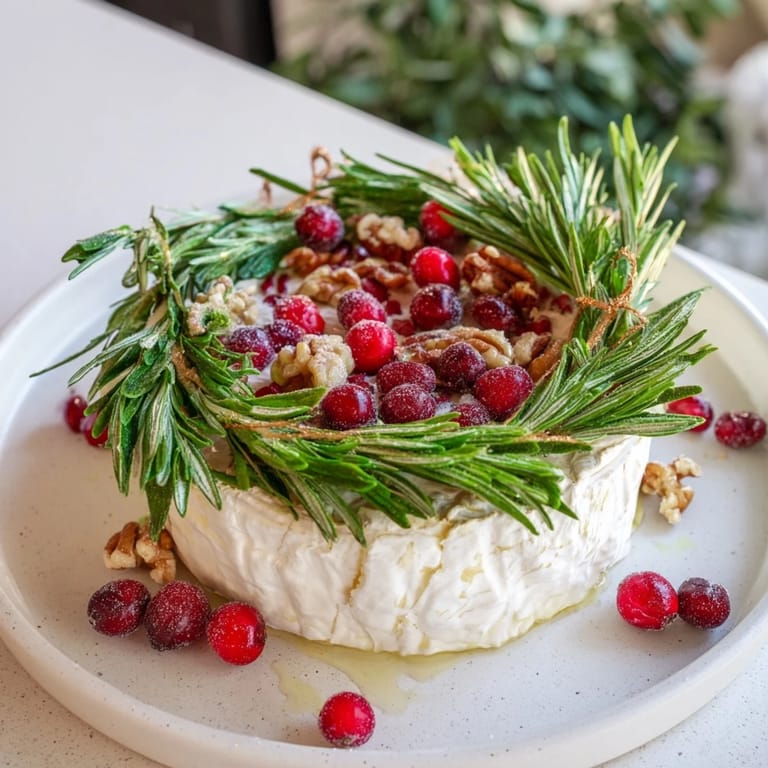 Épingler Une entrée époustouflante et pourtant facile mettant en vedette un Brie crémeux, orné de brins de romarin frais et d'une touche festive—parfait pour les rassemblements et les tables de fête.
