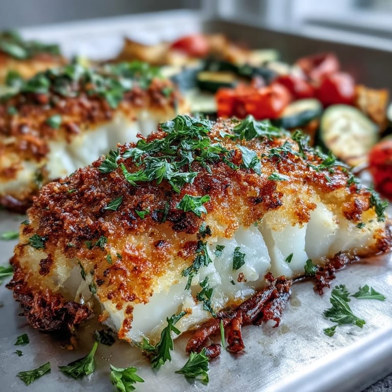 Épingler Experience the perfect balance of flavors and textures with this Parmesan Crusted Sheet Pan Fish & Veg. This easy one-pan meal features tender cod fillets topped with a savory, golden-brown crust of Parmesan, Asiago, and panko breadcrumbs. Surrounded by a rainbow of roasted bell peppers, zucchini, and tomatoes, it's a vibrant dish that brings a touch of Modern European cuisine to your weeknight table in just 45 minutes.