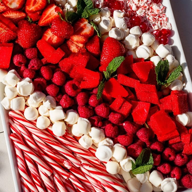 Épingler Un plateau de desserts festif composé de friandises rouges et blanches disposées en rayures rappelant un sucre d'orge—parfait pour les rassemblements de fête.