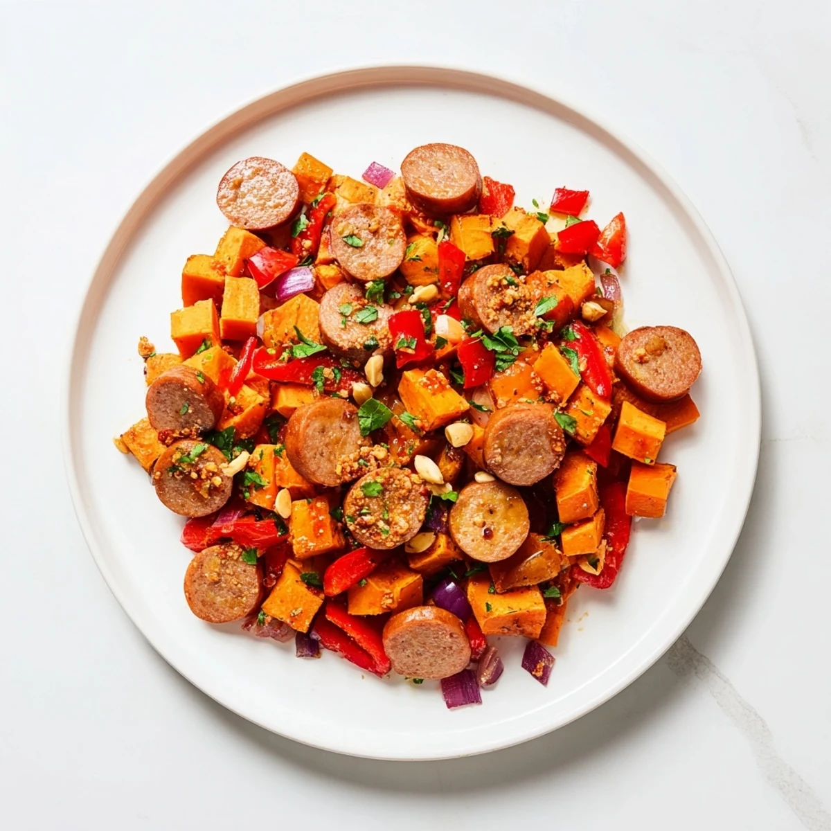 Mélange épicé de chorizo, patates douces et ail doré, parfait pour un repas rapide et savoureux.