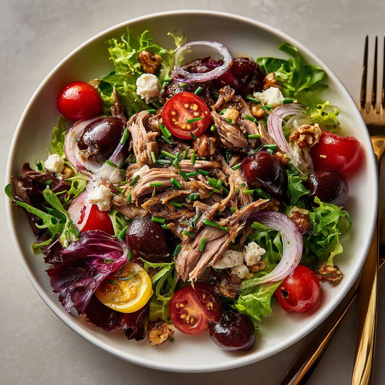 Épingler Cette salade raffinée marie la générosité du confit de canard à la douceur acidulée des cerises fraîches, sur un lit de verdure croquante. Parfaite pour un repas principal estival, elle évoque la gastronomie du Sud-Ouest tout en apportant fraîcheur et équilibre.