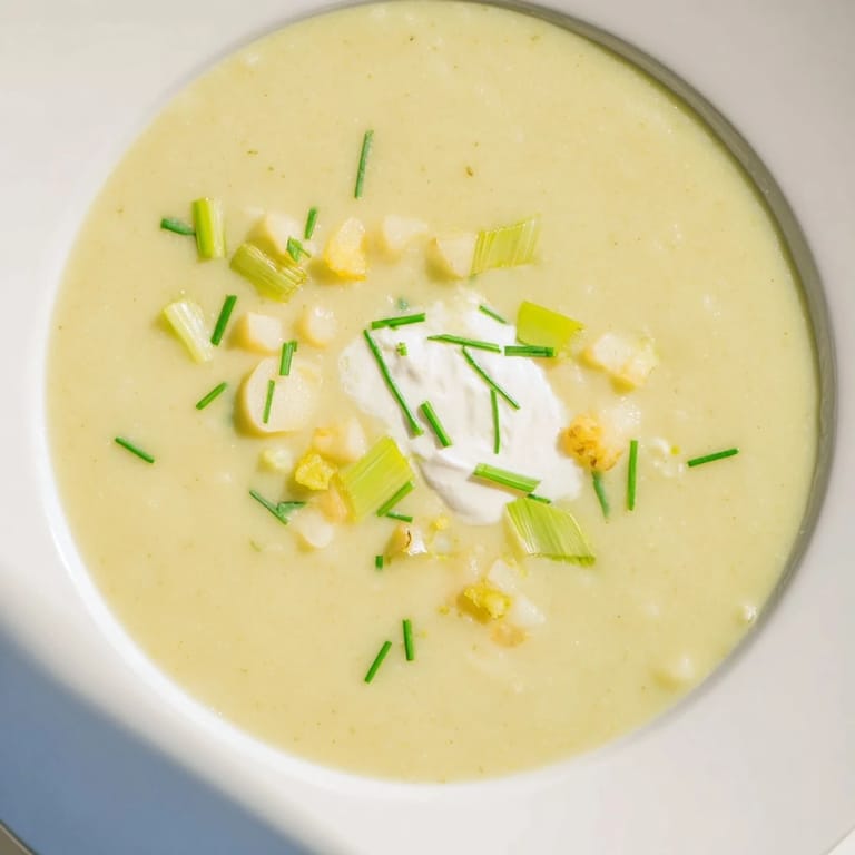 Épingler Une soupe réconfortante et veloutée mettant en vedette des poireaux et des pommes de terre tendres, parfaite pour un dîner convivial et économique.