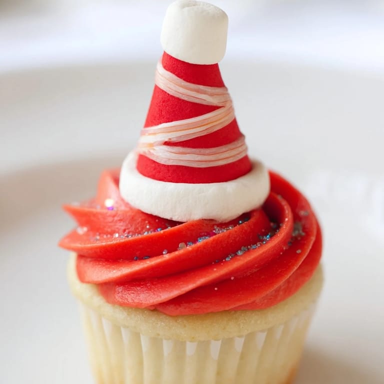 - Placez un chapeau d'elfe sur chaque cupcake glacé en appuyant délicatement pour fixer.