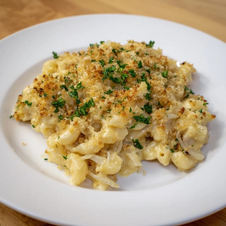 Épingler Un gratin réconfortant qui fusionne la soupe à l'oignon française classique et le mac and cheese crémeux, cuit dans une seule casserole pour une saveur maximale et un nettoyage minimal.