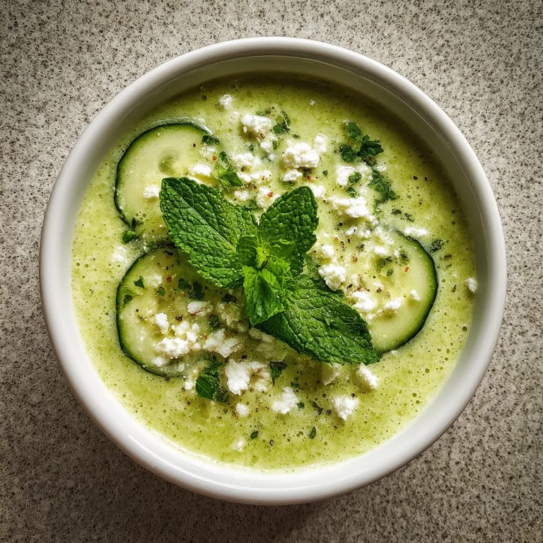 Épingler Ce gaspacho de concombre et menthe revisite la soupe froide espagnole avec une note ultra rafraîchissante. Parfait pour égayer les journées d’été ou ouvrir un repas, il combine douceur végétale, éclat herbacé et le crémeux salé de la feta pour une entrée légère inoubliable.