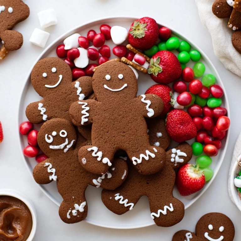 Épingler Un plateau de biscuits bonhomme en pain d'épices festif et fantaisiste mettant en vedette des biscuits classiques bonhomme en pain d'épices, accompagné d'une assortment vibrant de douceurs sucrées, de trempettes et de fruits frais parfait pour les rassemblements des fêtes.