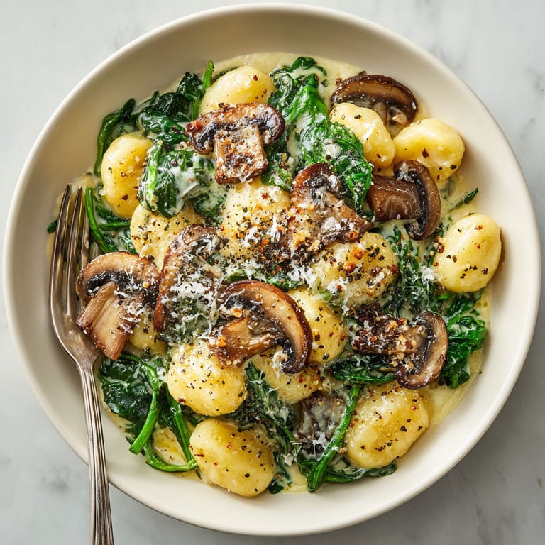 Épingler Un plat réconfortant qui associe la tendresse des gnocchis, la douceur des épinards et la gourmandise des champignons dans une sauce crémeuse au parmesan. Parfait pour un soir de semaine où l’on veut à la fois simplicité et saveurs, ce dîner végétarien est prêt en moins de 30 minutes.