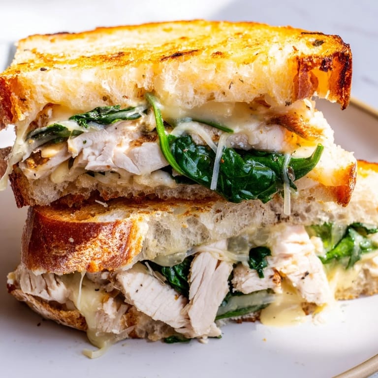 Épingler There's something about pressing a warm panini that makes everything else fade away. I discovered this particular sandwich combination on a Tuesday afternoon when I was raiding my fridge—some leftover grilled chicken, a handful of fresh spinach, and half a block of mozzarella that needed rescuing. Ten minutes later, I was biting into something golden and impossibly good, the kind of meal that reminds you why simple cooking is sometimes the best cooking.