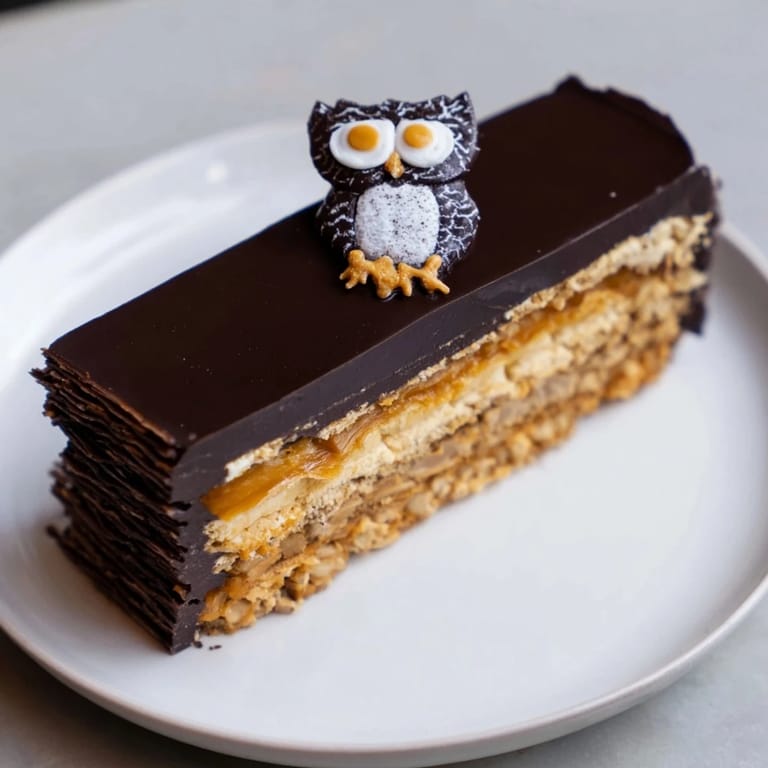 - Démouler gâteau. Verser glaçage refroidi sur mousse, laisser couler sur les côtés. Réfrigérer 15 minutes. Faire fondre chocolats blanc et noir séparément, former petites formes hibou sur papier sulfurisé, réfrigérer jusqu'à durcissement, décorer gâteau. Optionnel : saupoudrer de poudre d'or ou cacao.