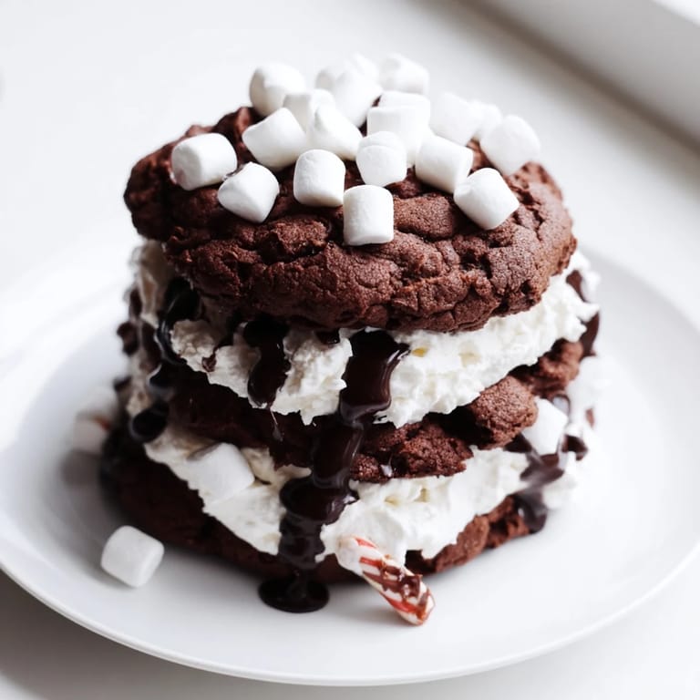 Épingler Une recette ludique et décadente présentant des couches de biscuits au chocolat et un glaçage moelleux à la guimauve, empilés pour ressembler à une tasse chaleureuse de chocolat chaud.