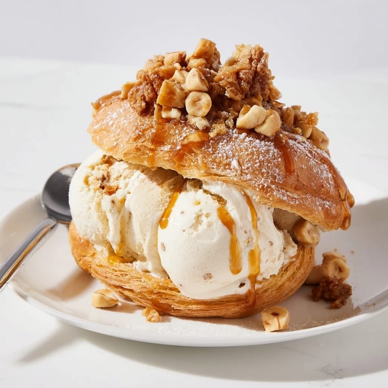 Épingler Un dessert fantaisiste qui fusionne la pâtisserie classique Paris-Brest avec une glace au soda au gingembre, des noisettes caramélisées et un sirop de gingembre zesté pour une gourmandise rafraîchissante et indulgente.